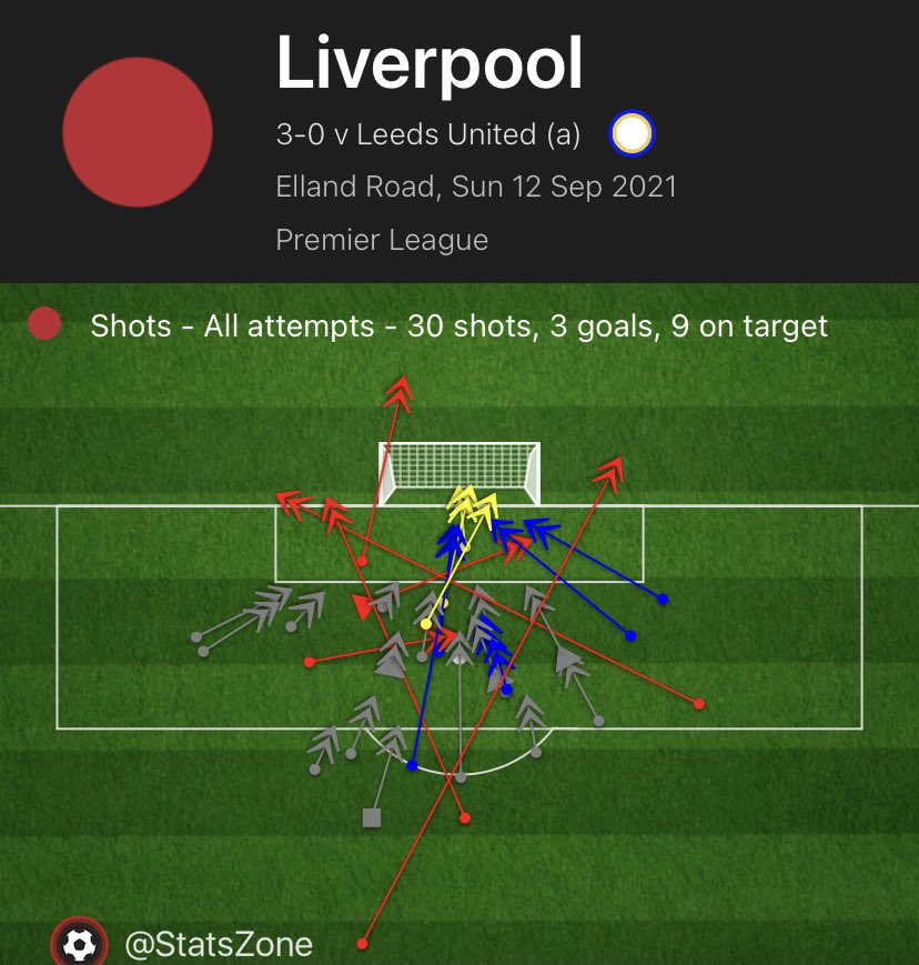 100 - Liverpool had 30 shots against Leeds, taking their tally to 100 for the season in the Premier League. They’re just the second side since 2003-04 to have had 100+ shots in their first four Premier League games in a single campaign, after Chelsea in 2009-10 (109). Peppering.