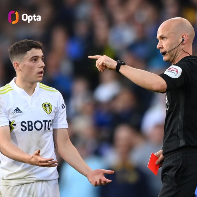 100 - Dan James’ red, followed by Kalvin Phillips’ yellow means Leeds this season are the first team to receive 100 cards in a single Premier League campaign (97 yellows, 3 reds). Feisty.