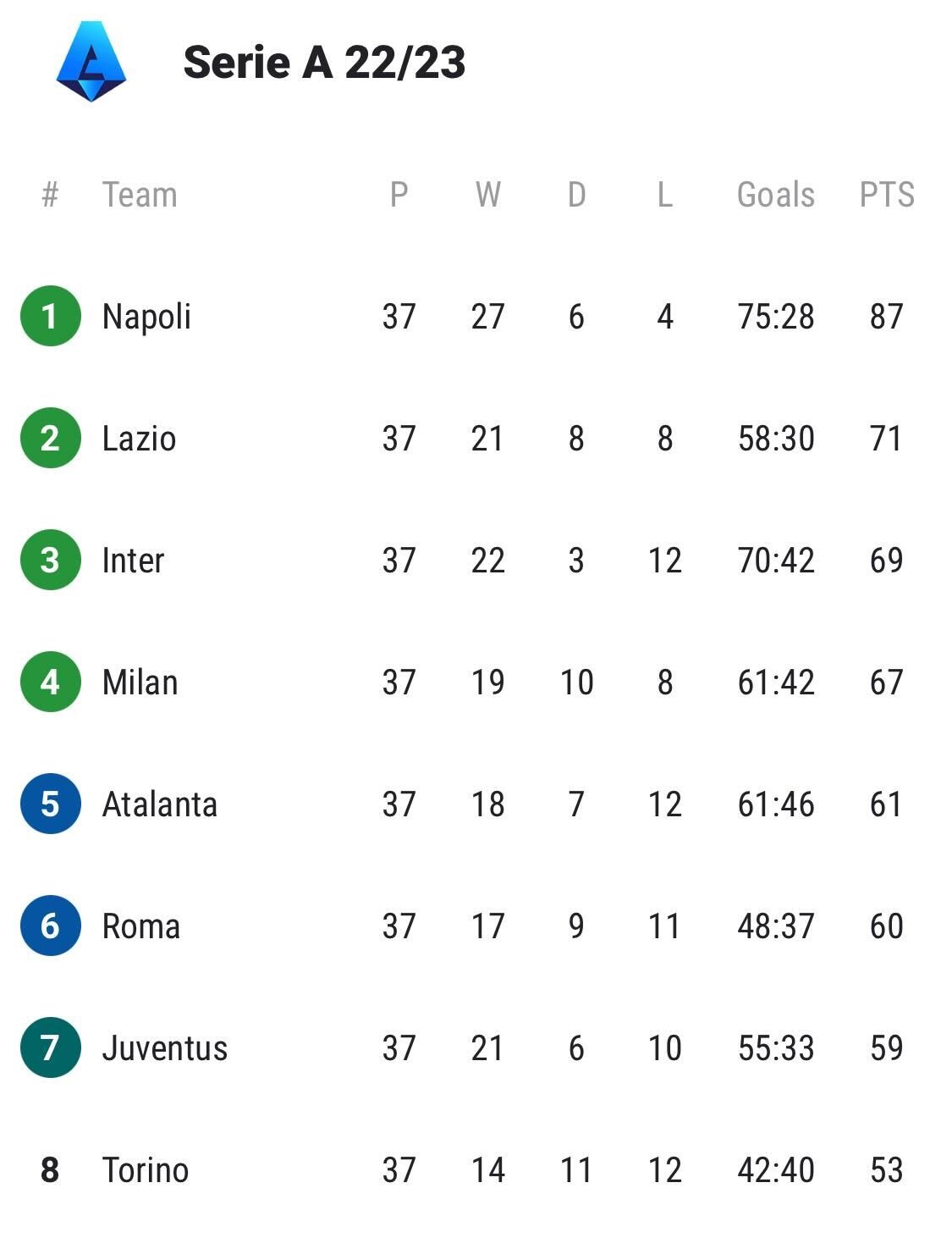 Milan’s win over Juventus means we now know all four Serie A sides that will participate in the UEFA Champions League next season — congrats to Napoli, Lazio, Inter and Milan! ![]()