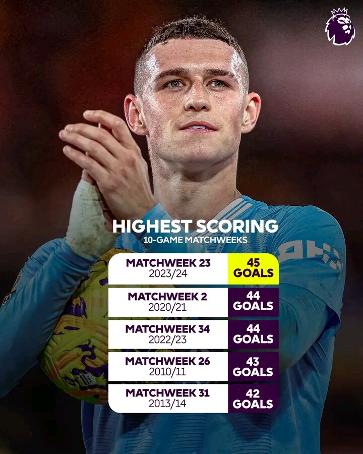 45 - There were 45 goals scored across this weekend’s 10 Premier League games, the second highest scoring matchday in Premier League history (53 goals on MD42 in 1992-93) and the highest scoring matchday in a 20 team season (since 1995-96). Entertained.