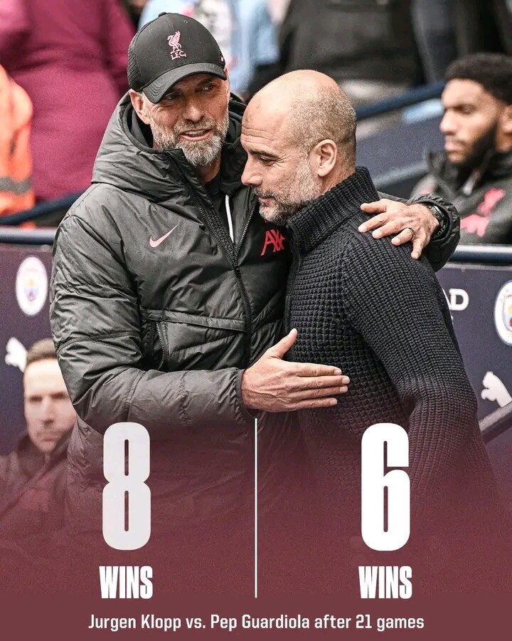 Jurgen Klopp has won 8 of his 21 meetings against Pep Guardiola.