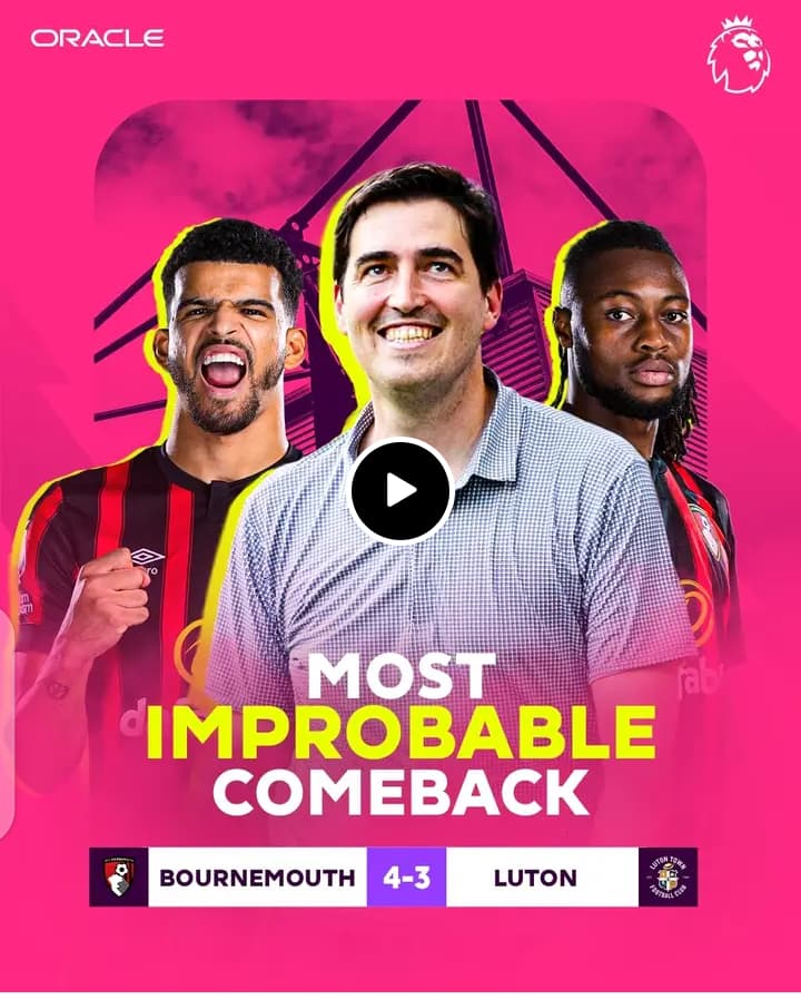 AFC Bournemouth win the Oracle Most Improbable Comeback award for their 4-3 win against Luton. Only the fifth time in Premier League history a team has won from 3-0 down! ![]()