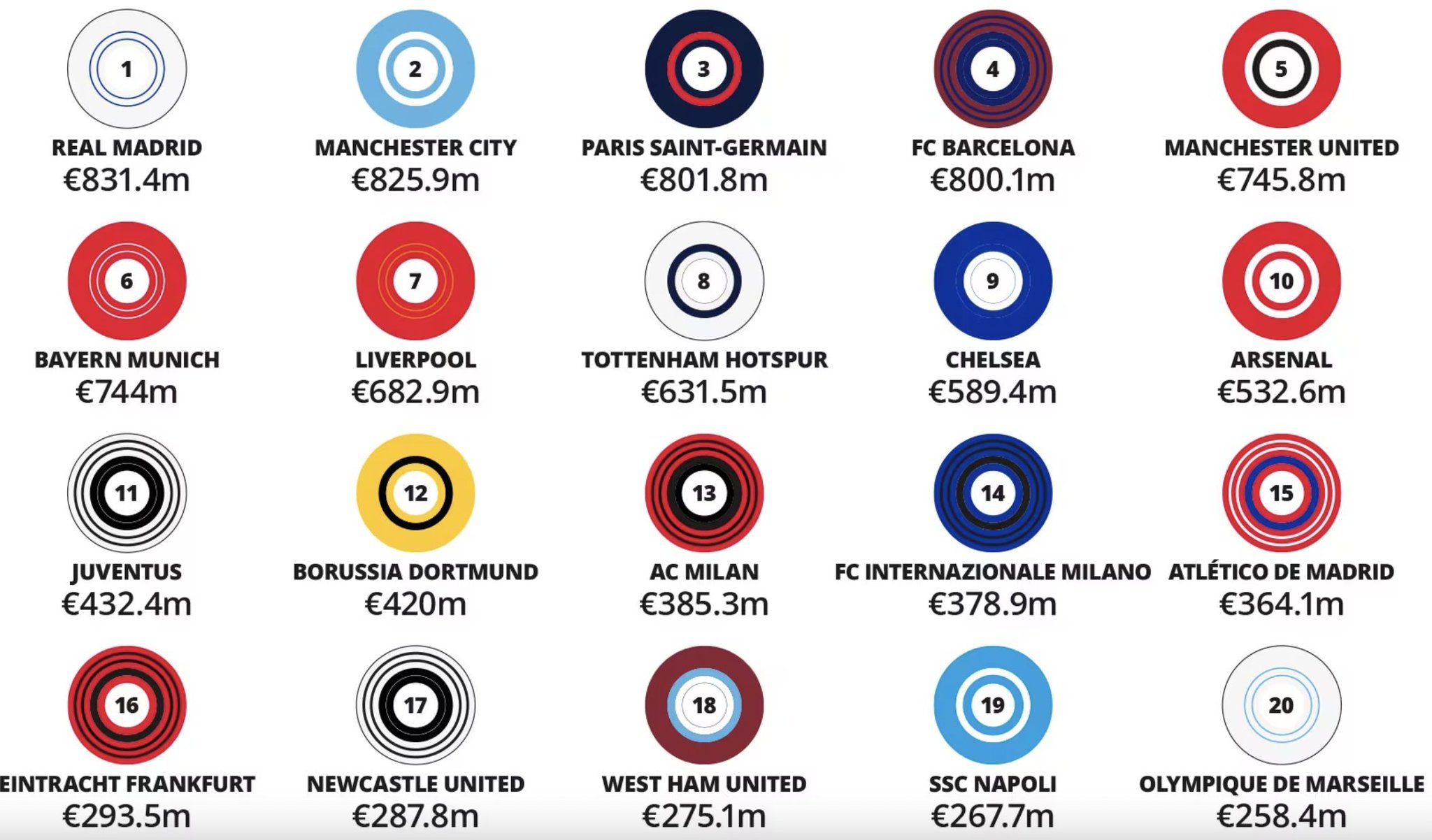𝗢𝗙𝗙𝗜𝗖𝗜𝗔𝗟: The top 20 richest clubs in the world, based on last season’s revenue.