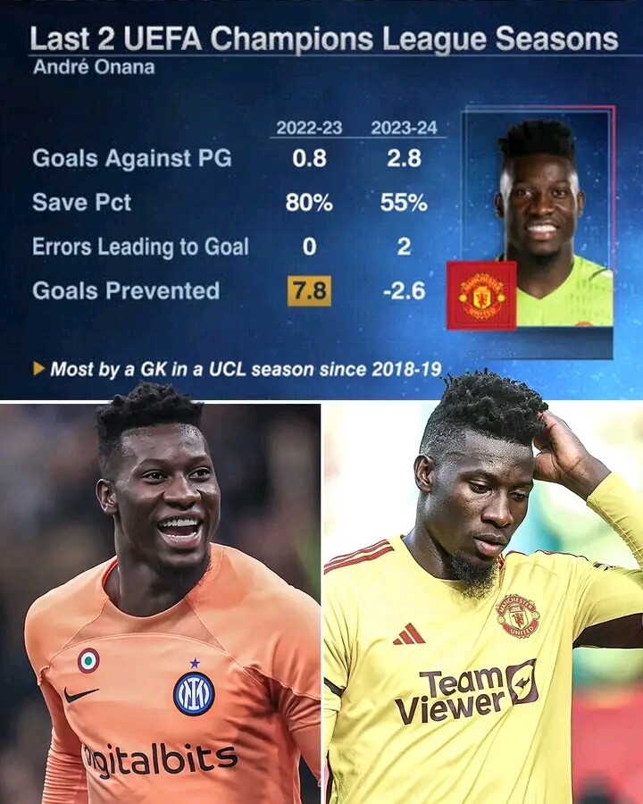 Andre Onana’s form in the Champions League last season with finalists Inter Milan compared to this season with Man United.