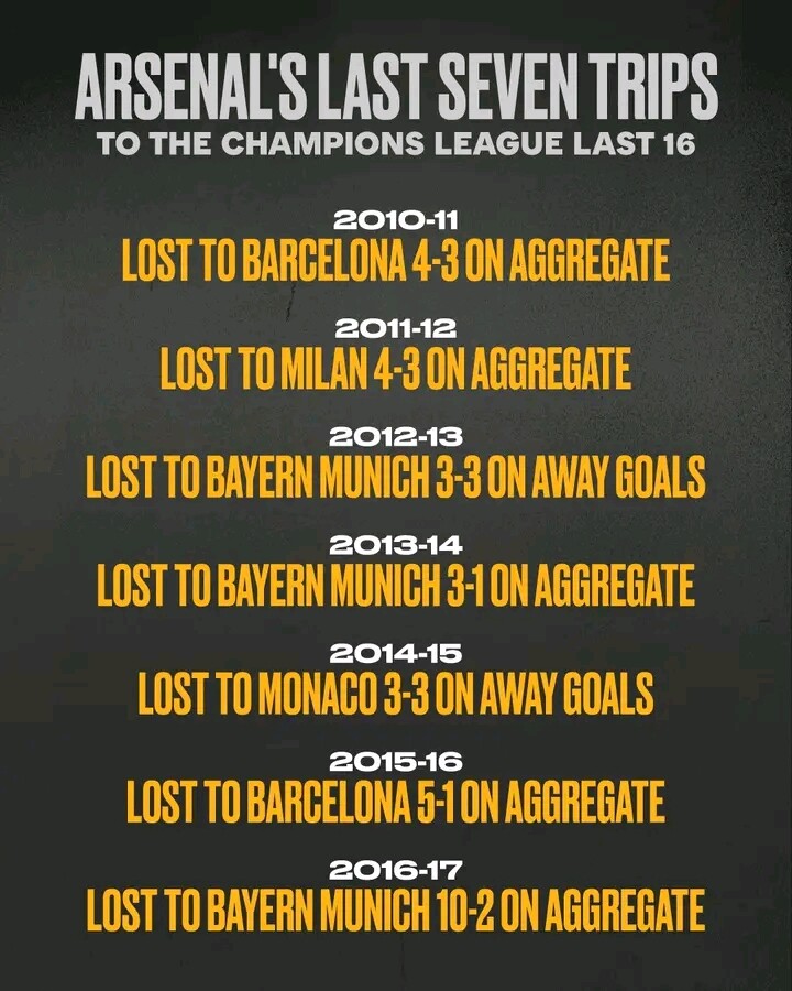 Arsenal are in the last 16 of the Champions League for the first time in seven years and they’ve lost their last seven trips to the last 16. On a mission to banish the demons ![]()