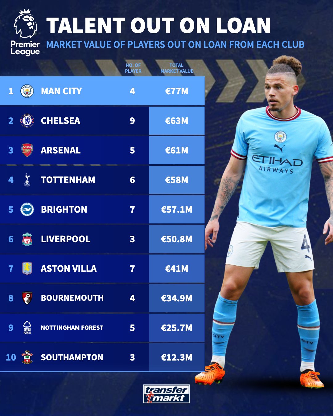 The Premier League clubs have loaned out players with a combined market value of €509M.