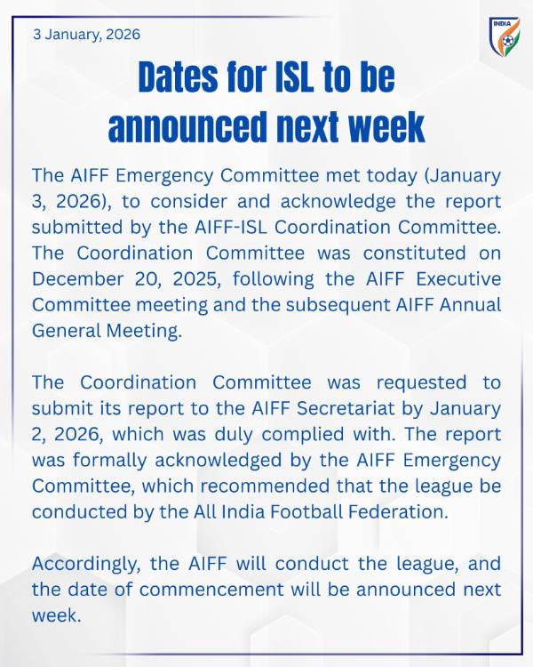 "The AIFF Emergency Committee met today (January 3, 2025) to consider and acknowledge the report submitted by the AIFF-ISL Coordination Committee.