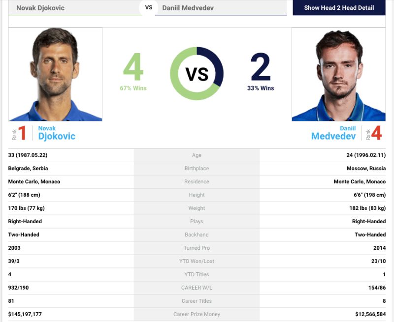 Zverev holds a 5-2 ATP Head2Head edge in their rivalry, but the Russian has taken two of the past three encounters. Zverev has played in the Nitto ATP Finals four times, compiling a 7-5 record while winning the event in 2018, when he beat Roger Federer. Last season, Sascha lost in the semi-finals of the event to Dominic Thiem.