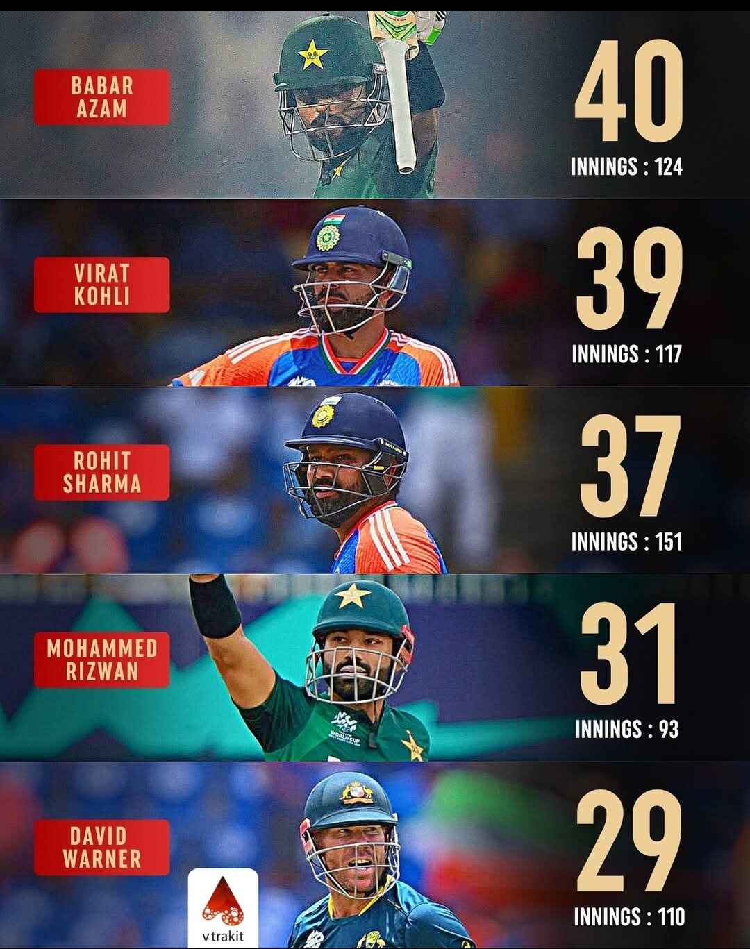 Pakistanโs Babar Azam surpasses Virat Kohli to claim the record for the most 50+ scores in T20I history! ![]()