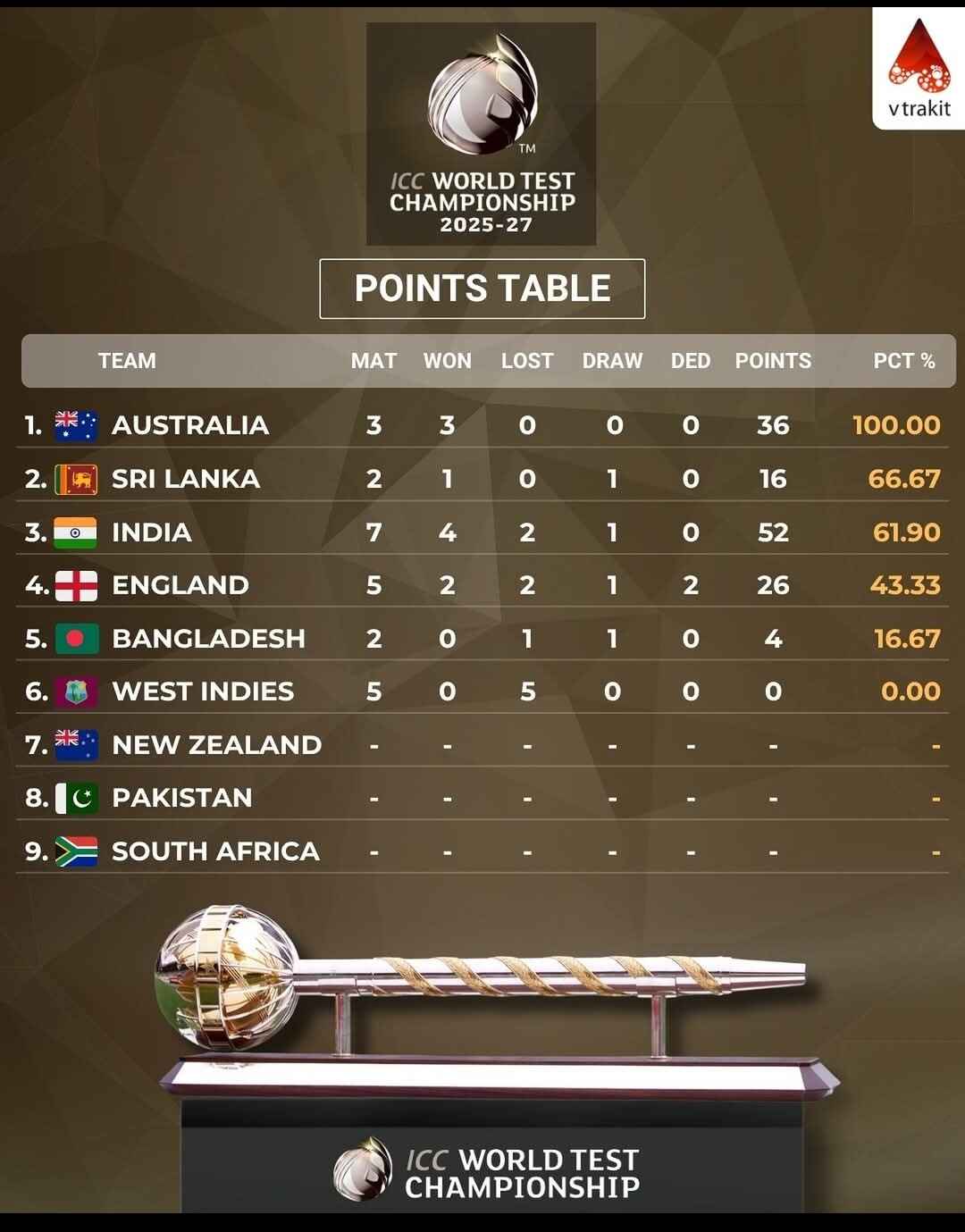 India climb to No. 3 in the CC World Test Championship 2025โ27 points table after a commanding 2-0 series win over West Indies!![]()