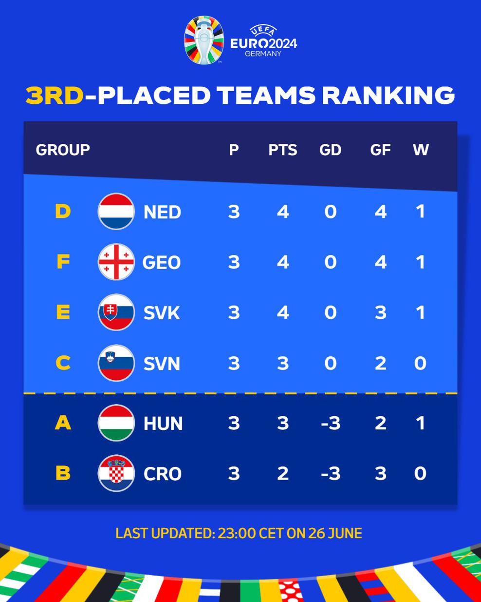 While the top two in every UEFA EURO 2024 group were guaranteed a berth in the round of 16, only the four best third-placed teams joined them in advancing. This is how the final picture looked.