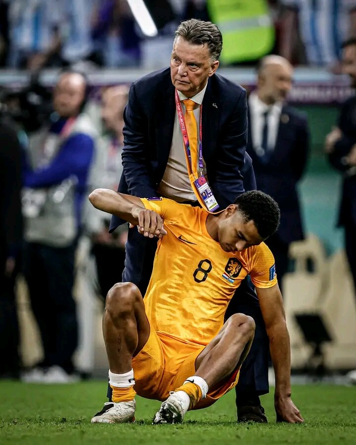 71-year-old Louis van Gaal was the first person on the pitch to pick up Cody Gakpo.