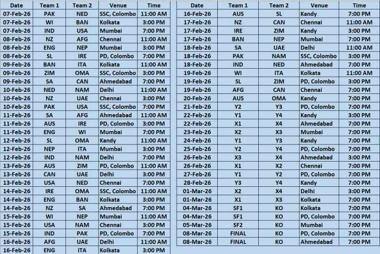 Fixtures of ICC Men’s T20 World Cup 2026 – India & Sri Lanka: