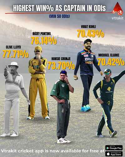Winning % of Indian captains in ODIs (min 20 matches):