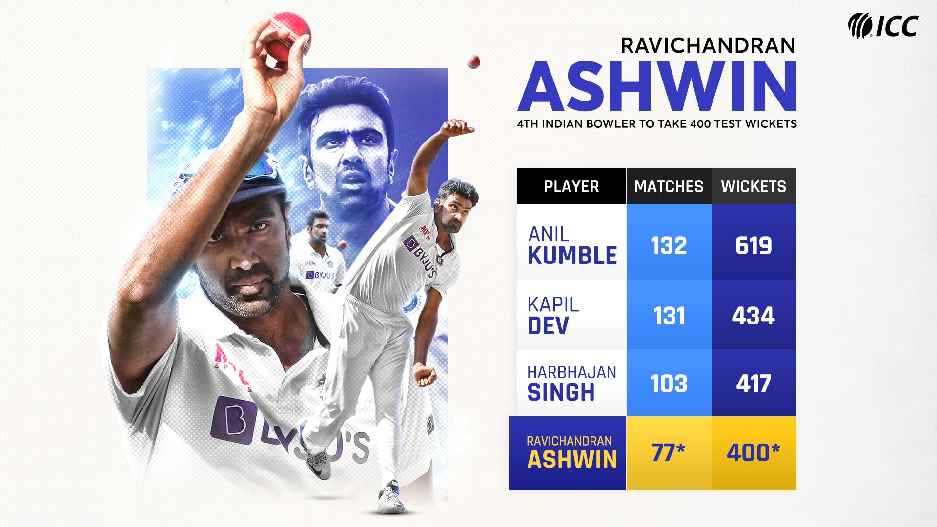 Ashwin needs 5 wickets to surpass Curtly Ambrose’s mark of 405 Test wickets. Ashwin has 401 wickets in 77 Tests so far.
