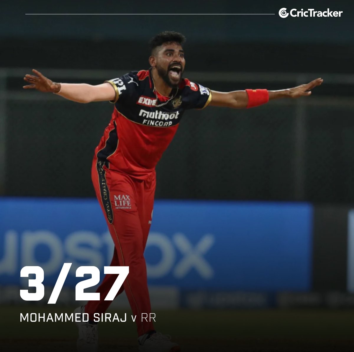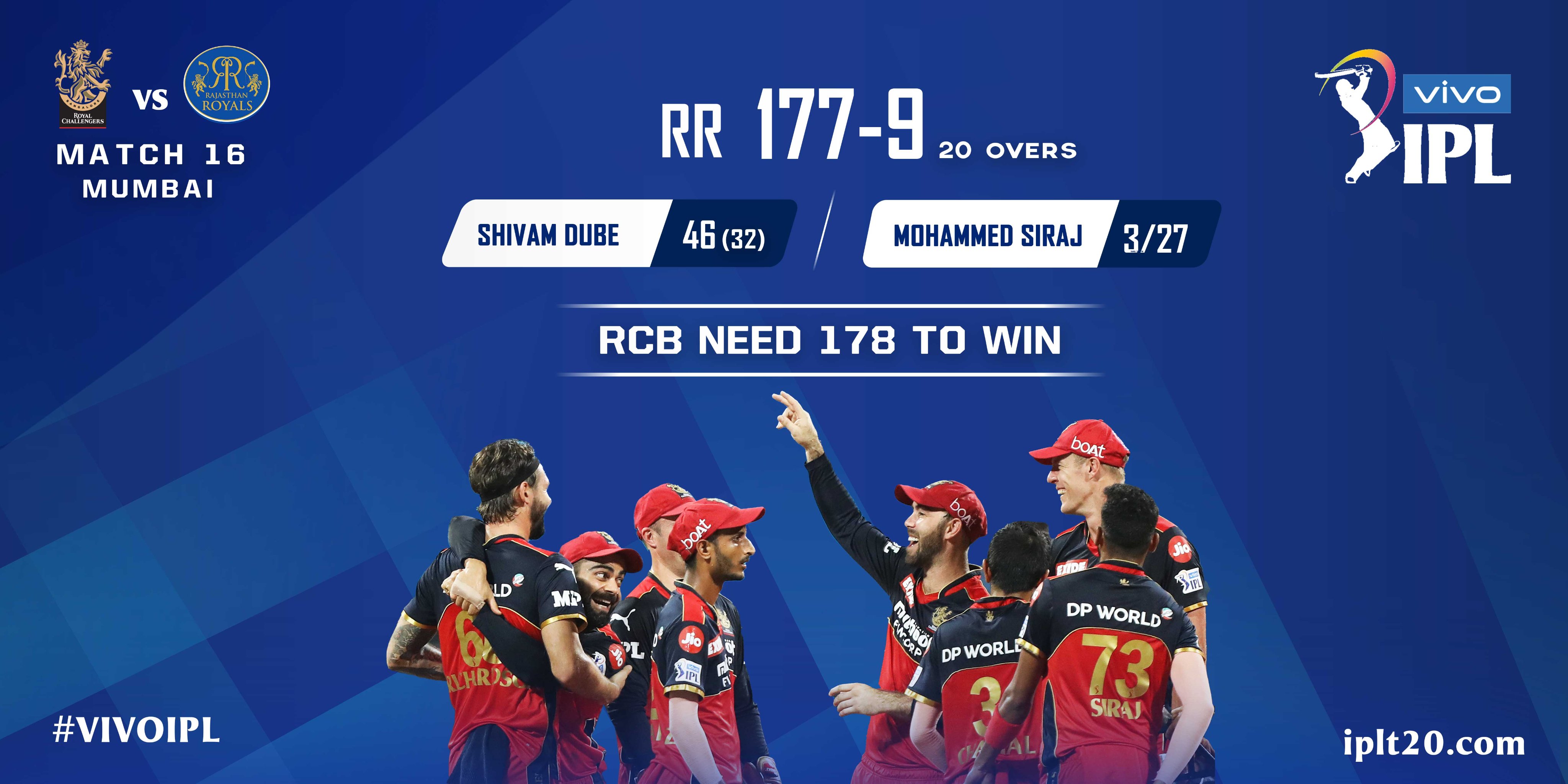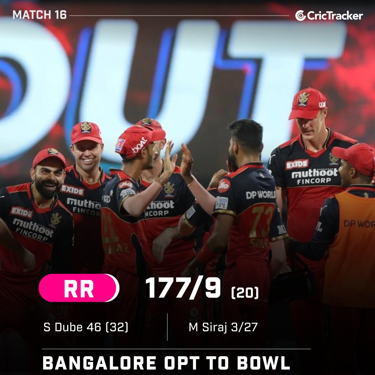 Three wickets apiece for Mohammed Siraj and Harshal Patel as RCB restrict RR to a total of 177/9 at The Wankhede.