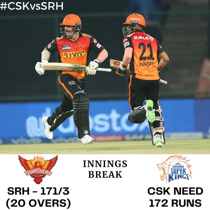 11 overs are up and SRH are 77-1. The Warner-Pandey partnership has crossed 50. CSK have introduced Jadeja into the attack now.