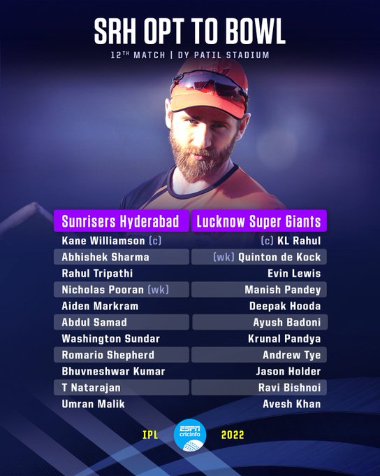 SRH name an unchanged XI, while Jason Holder is the only change for Lucknow ![]()