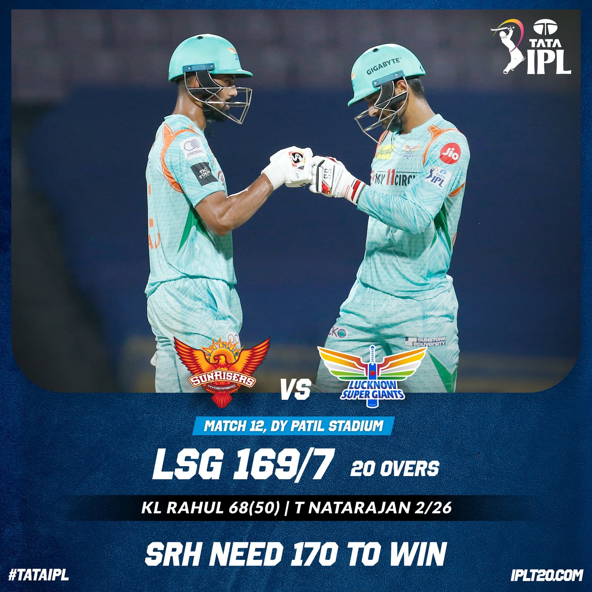 87-run partnership between KL Rahul & Hooda propel LSG to a total of 169/7 on the board.