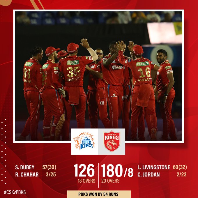 Chennai slumped to three consecutive defeats in their opening games for the first time in IPL history. Liam Livingstone was the star for Punjab Kings as he scored 60 off 32 balls and bagged two wickets for 25 runs to to power PBKS to 54 runs victory.