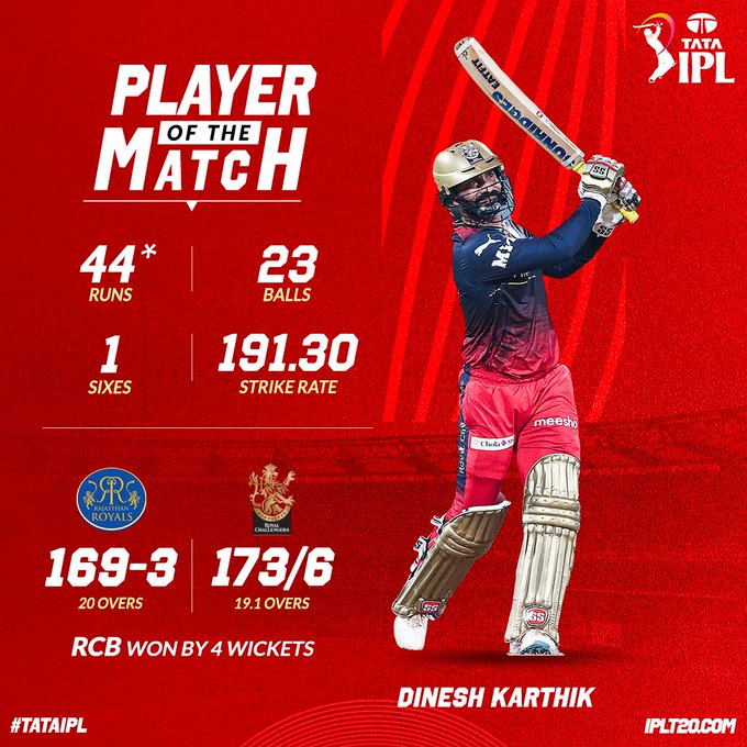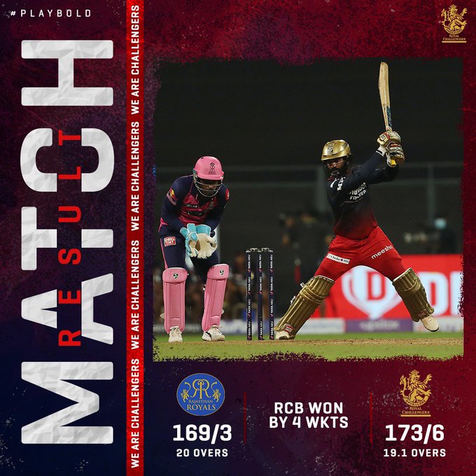 Riding on Shahbaz Ahmed’s 45 and Dinesh Karthik’s 44 not out, RCB chased down 170-run target in 19.1 overs to hand RR their first defeat of this year’s IPL.