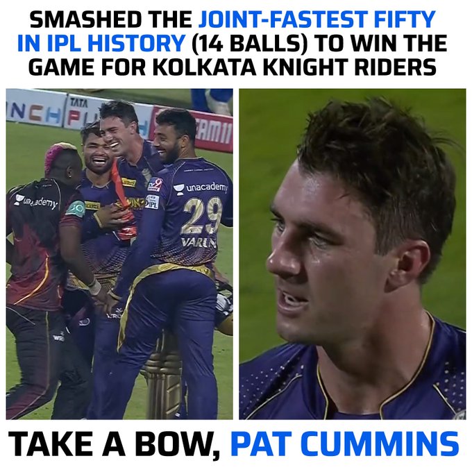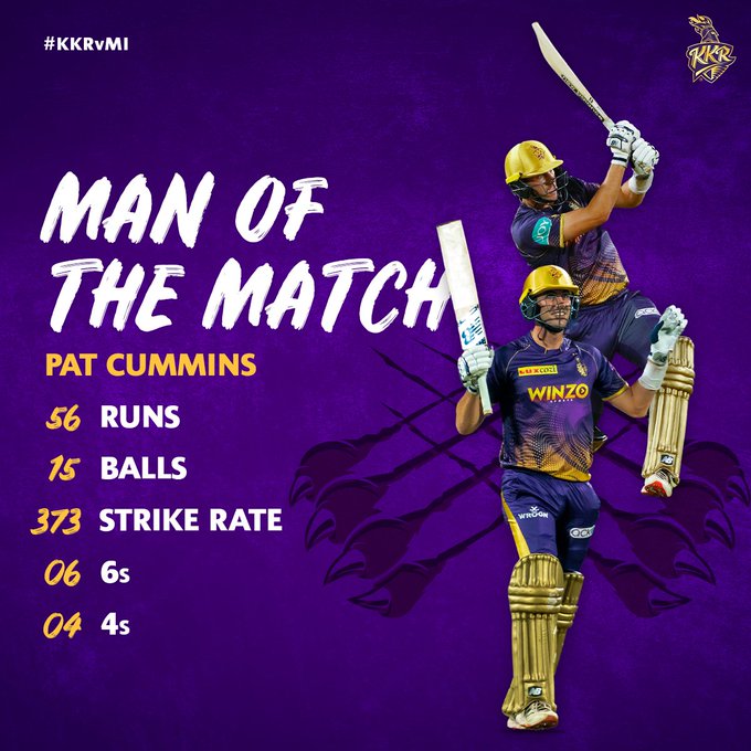 Player of the Match was none other than Pat Cummins for his stupendous knock of 56* off just 15 deliveries as KKR win by 5 wickets.