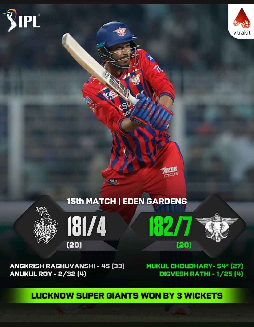 21-year-old Mukul Choudhary delivers a sensational finish for LSG, steering the Lucknow Super Giants to an unforgettable win over KKR at Eden Gardens! ![]()
