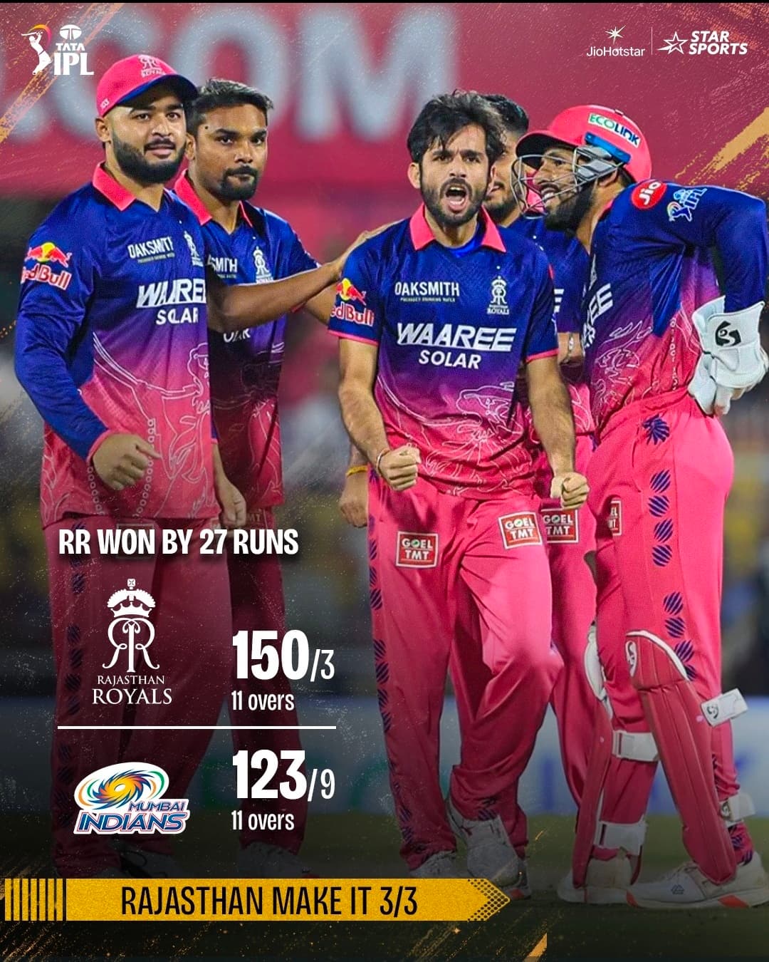 3 wins out 3 & RR roar Halla Bol! ![]()
