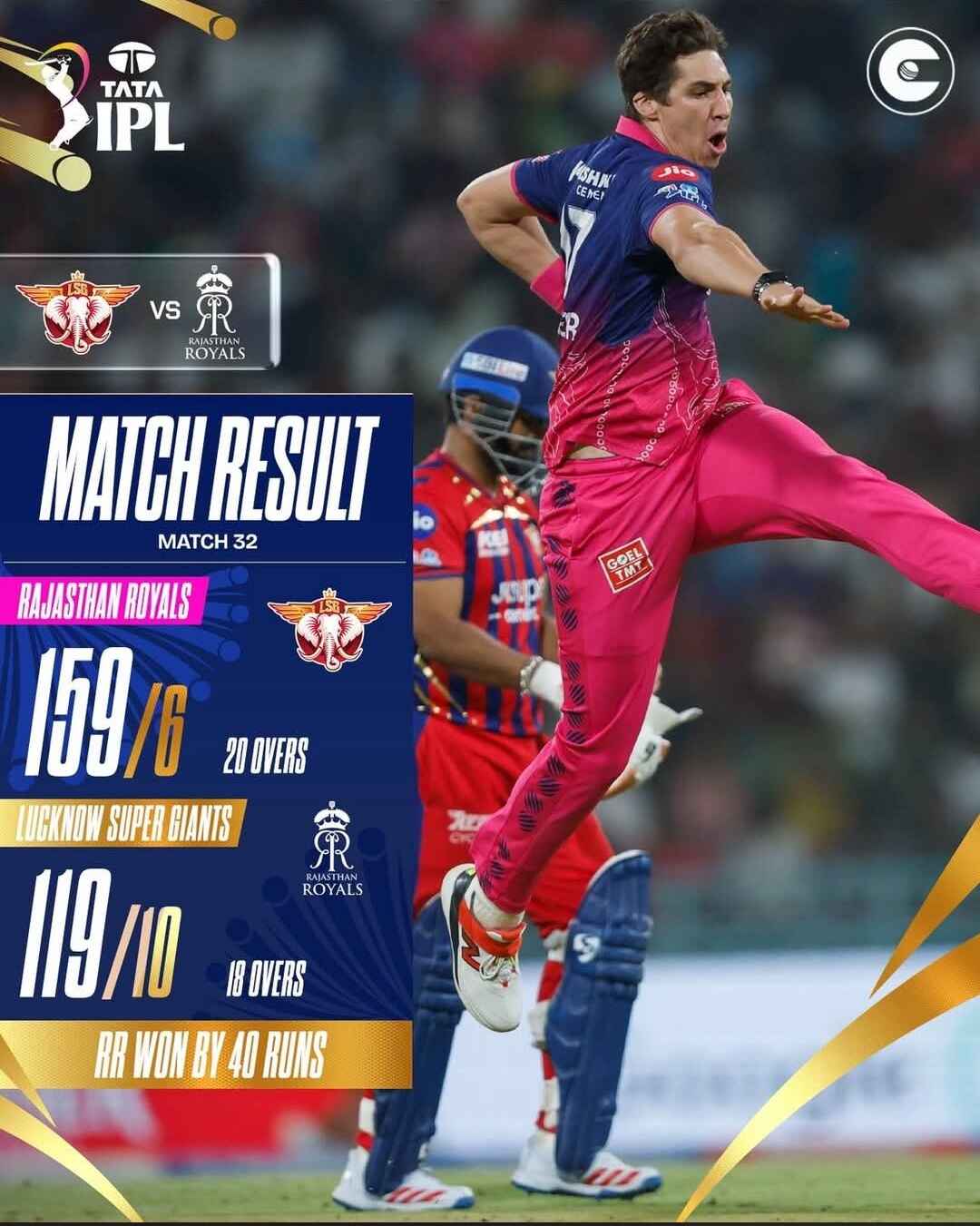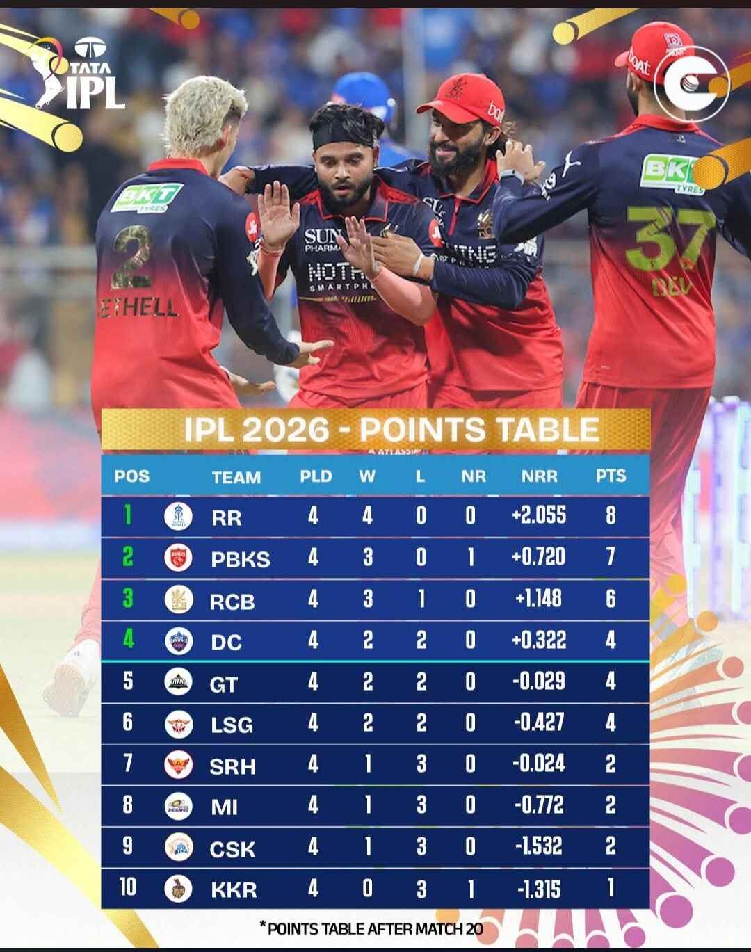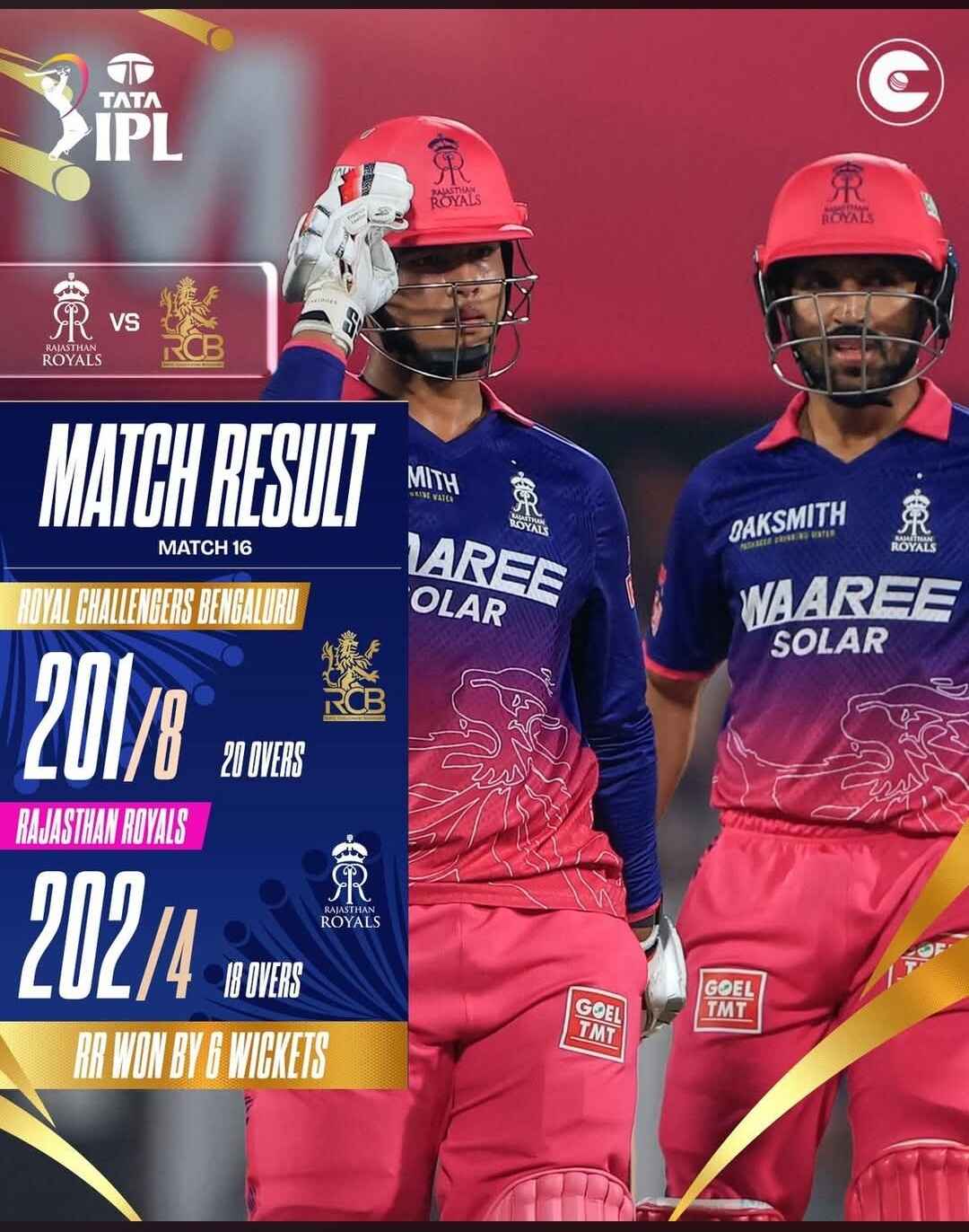 4/4 for Rajasthan Royals as they coasted towards the 202-run target courtesy brilliant fifties by Vaibhav Sooryavanshi (78) and Dhruv Jurel (81*).