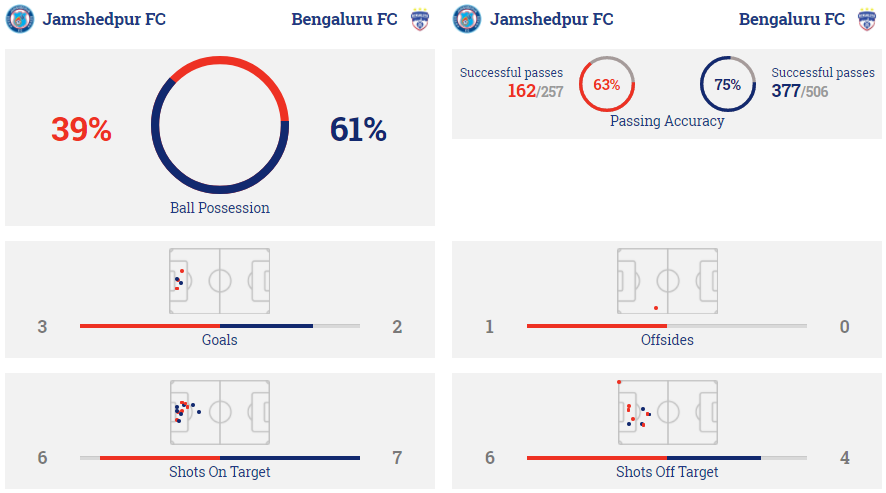 It was a complete turnaround from Bengaluru FC in the second half and they had seven shots on target and scored off the two of them. Jamshedpur FC did not have a single shot on target in the second half.