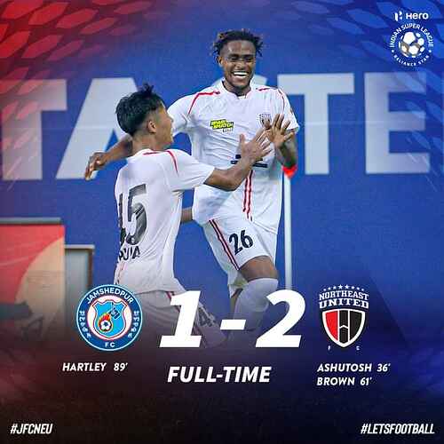Ashutosh Mehta opened the scoring with a stupendous header in the first half. Jamshedpur failed to respond to the opening goal and allowed debutant Deshorn Brown, who signed for NorthEast from Bengaluru, to double the lead after the break. Peter Hartley headed home a late goal but his first goal in the ISL wasn’t enough for Owen Coyle’s team.