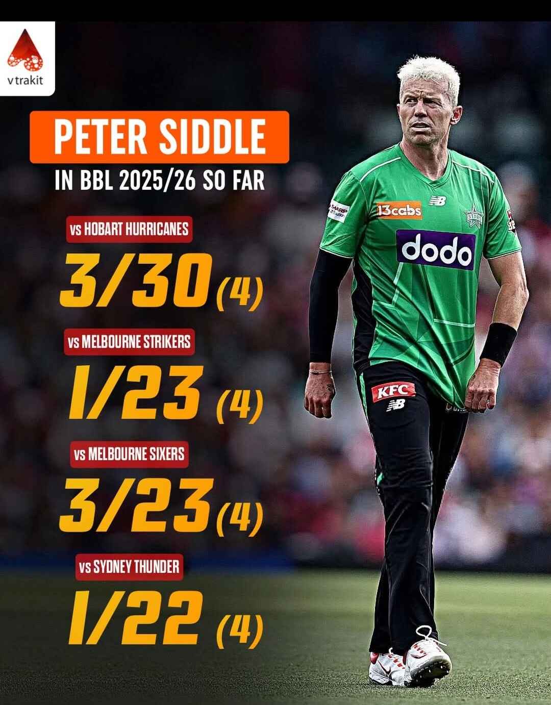 Retired from international cricket long ago and now 41, Peter Siddle is still terrorizing batsmen in the BBL at over 140 km/h, taking 8 wickets so far, averaging just 12.25 with an economy of only 6.12!
