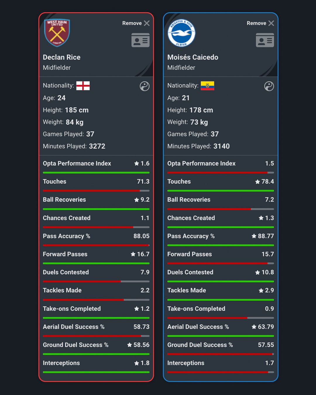 Two of the biggest names who are being rumoured to leave their clubs this summer are Declan Rice and Moises Caicedo, but who is the best between the two?