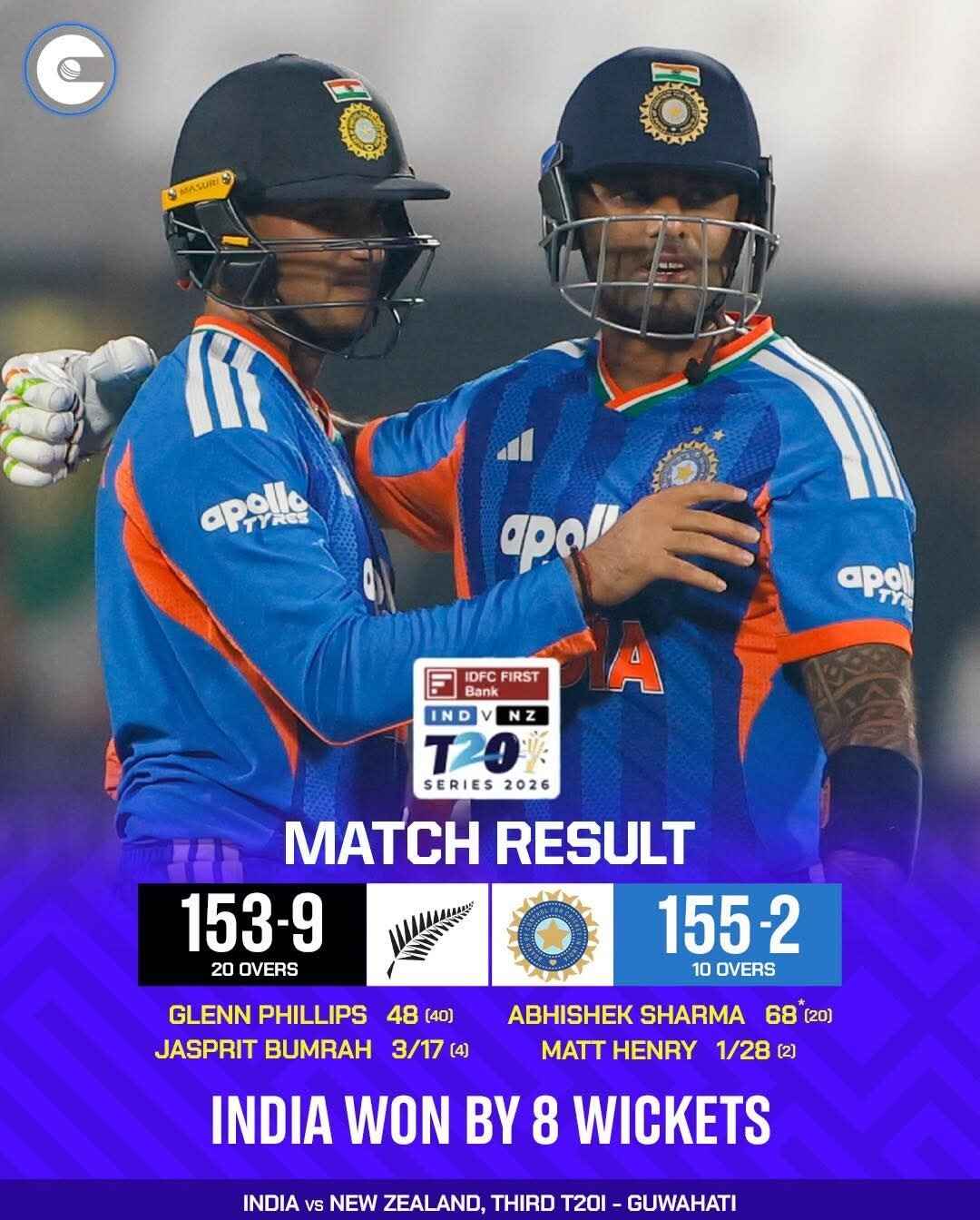 This is New Zealandβs first win over India after 8 consecutive ODI defeats!