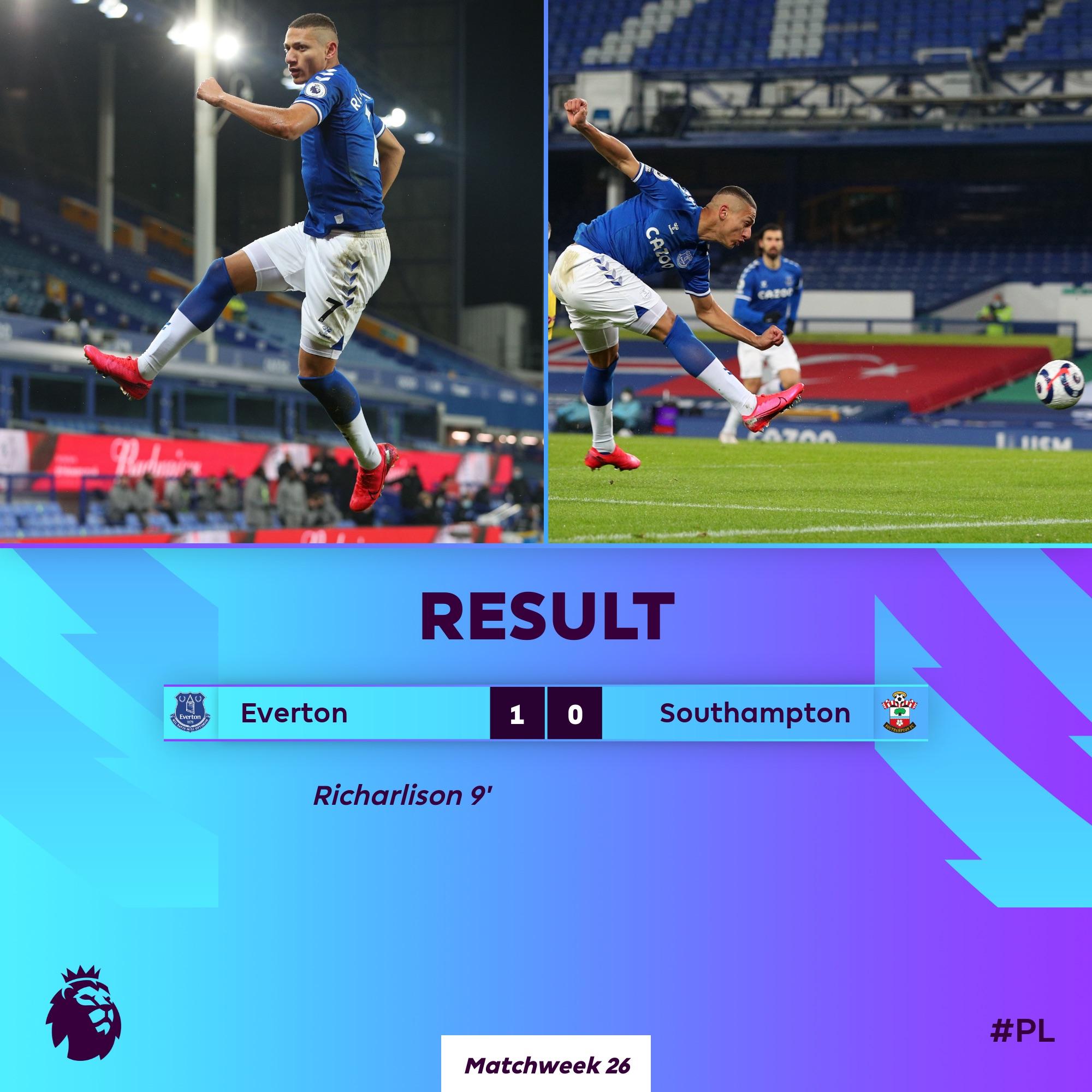 Richarlison’s 9th minute strike gives the Toffees the lead at the break.
