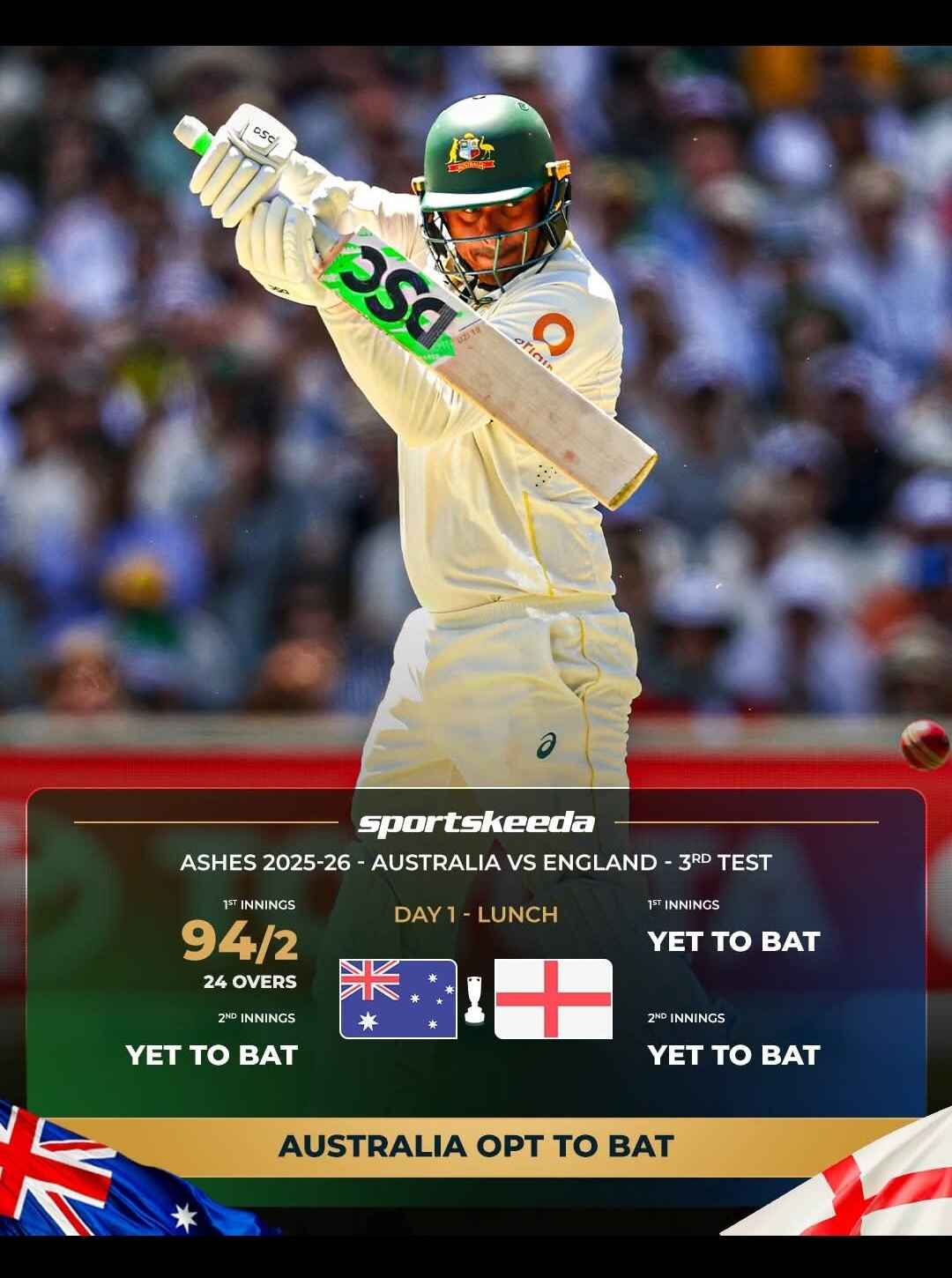 Australia reach 94/2 at the end of the morning session after choosing to bat first. ![]()