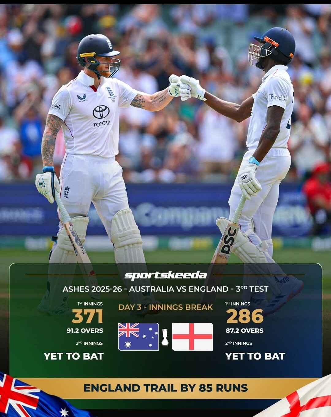 England are bowled out for 286, handing Australia an 85-run lead after the first innings. ![]()