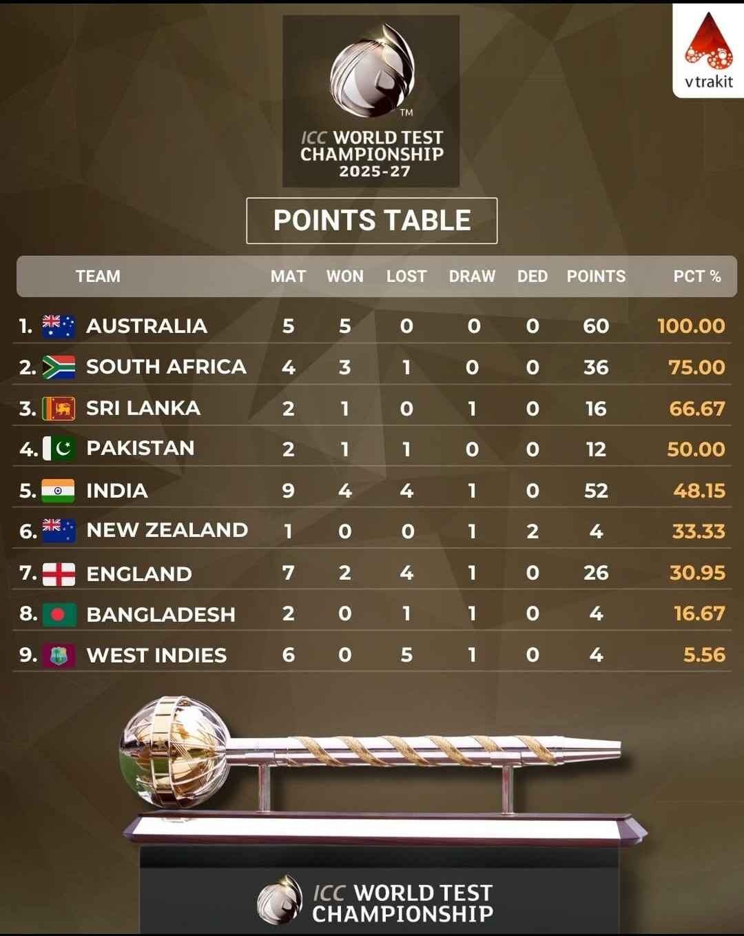 Australia extend their dominance in the World Test Championship, strengthening their hold on the top spot with a flawless 100% winning run this WTC cycle, highlighted by another strong Ashes performance!![]()
