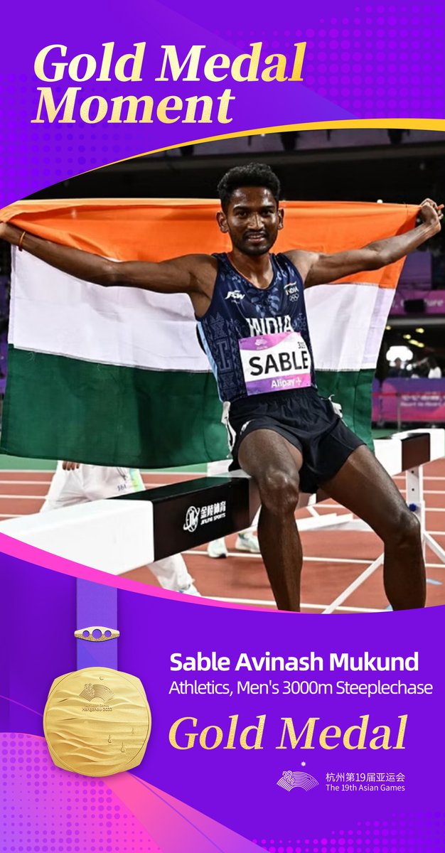 Congratulations to Team India’s Sable Avinash Mukund for defeating Team Japan’s Aoki Ryoma (Silver) and Sunada Seiya (Bronze) to win the gold medal in Athletics, Men’s 3000m Steeplechase event at Hangzhou Asian Games. Congratulations! ![]()