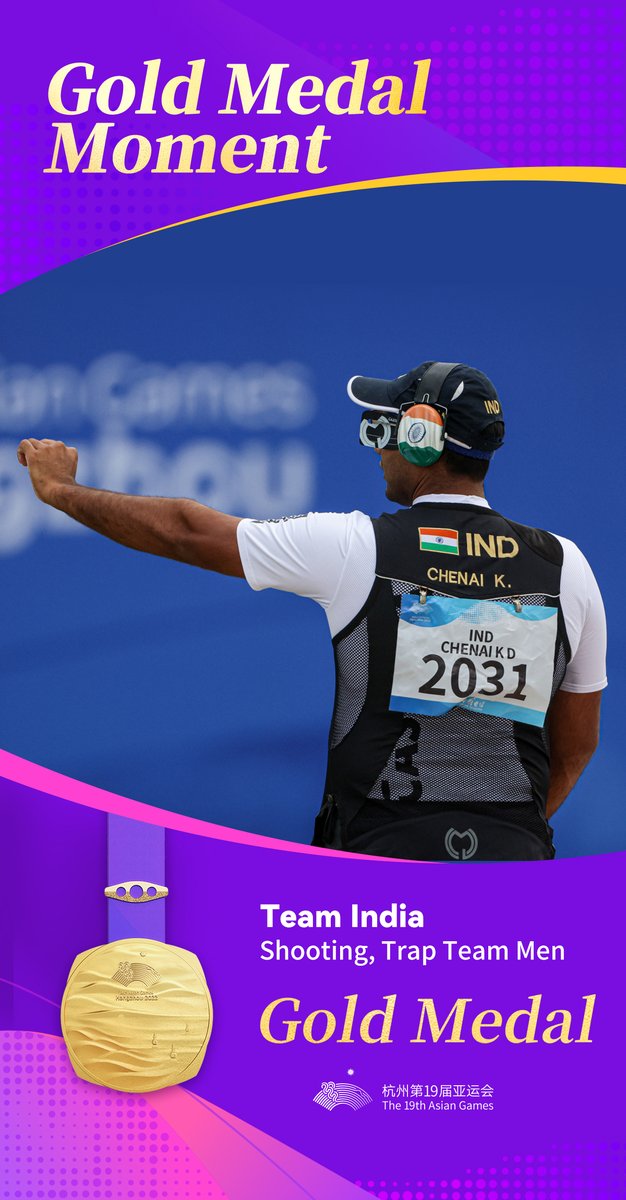 Team India’s trio Chenai Kynan Darius, Sandhu Zoravar Singh and Tondaiman Prithviraj defeated Team Kuwait by 2 points and set a new Asian Games record to win the gold medal in Shooting, Men’s Trap Team event, at the 19th Asian Games Hangzhou.